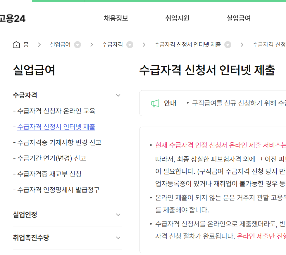 개인서비스에서 수급자격 신청서를 인터넷 제출하시면 됩니다. 하지만! 바로 작성하시지 말고! 아래로 쭉 내려보세요!