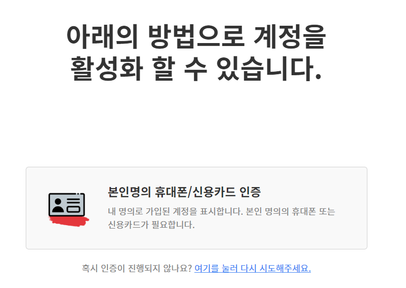 5. 비활성화 해제를 위해 휴대폰이나 신용카드를 준비해보자!