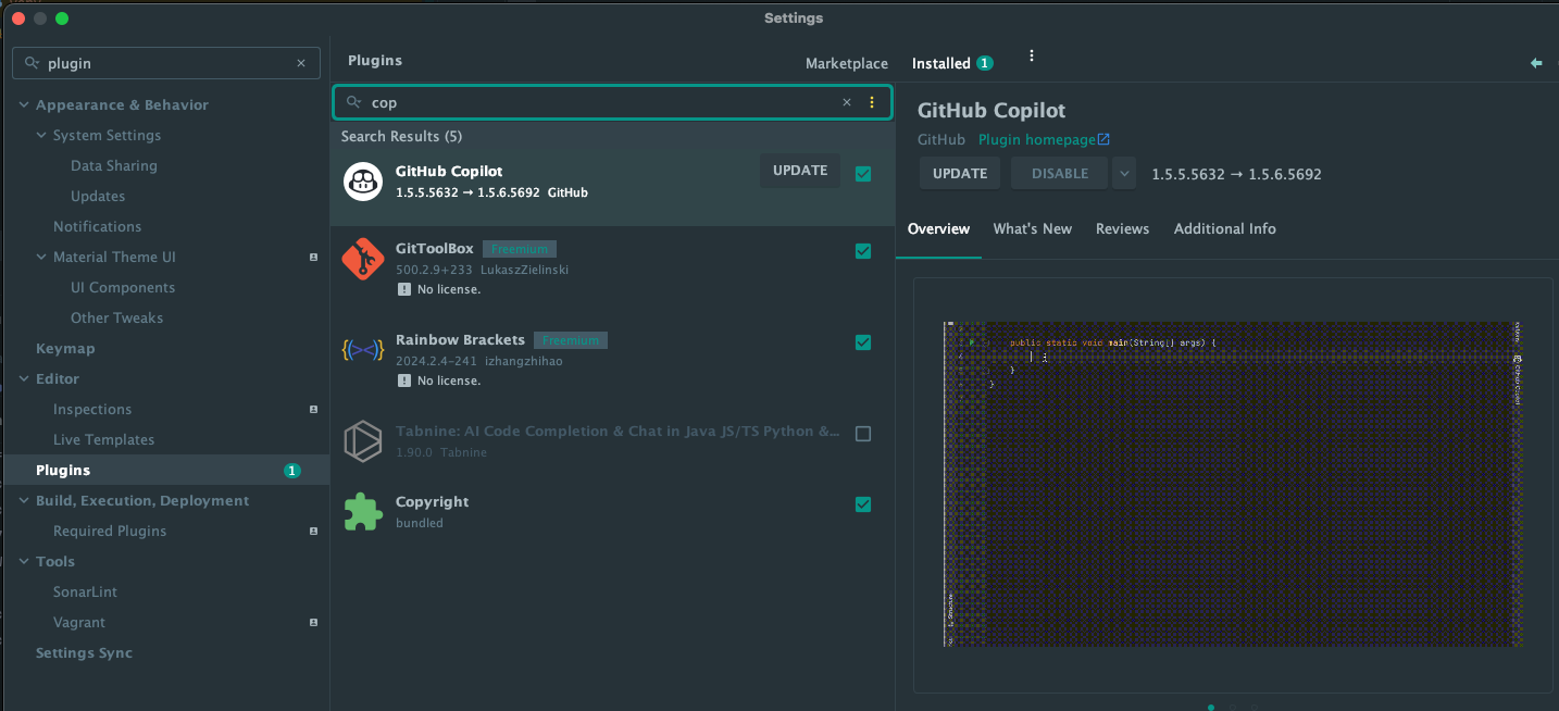 PyCharm의 경우, 플러그인 탭에서 ‘Marketplace’ 탭을 선택하여 GitHub Copilot을 설치해주시면 됩니다.