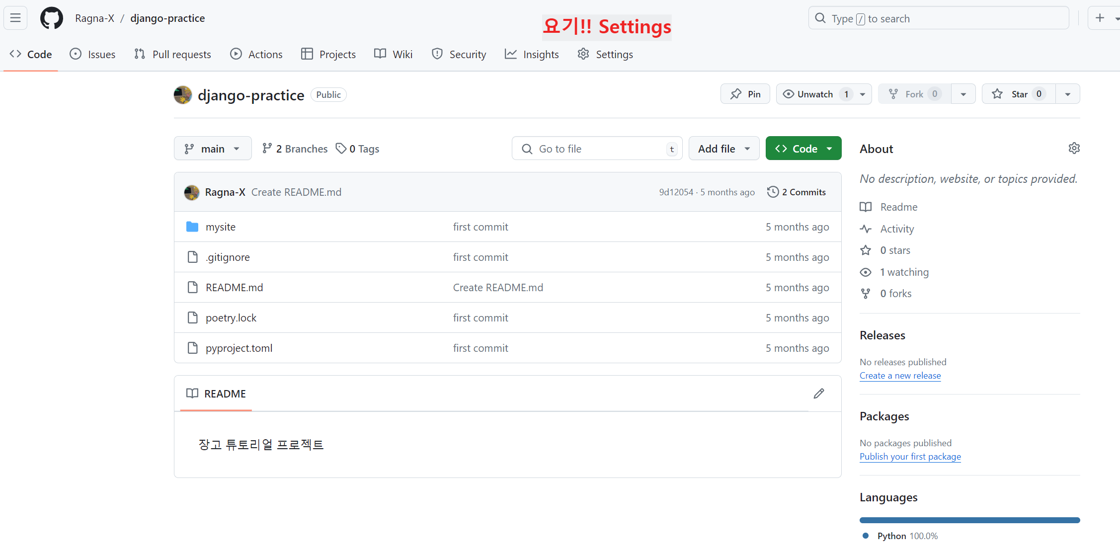 Github에서 접근 권한을 변경하려는 레포지토리로 이동합니다. 그리고 Settings를 누릅니다!