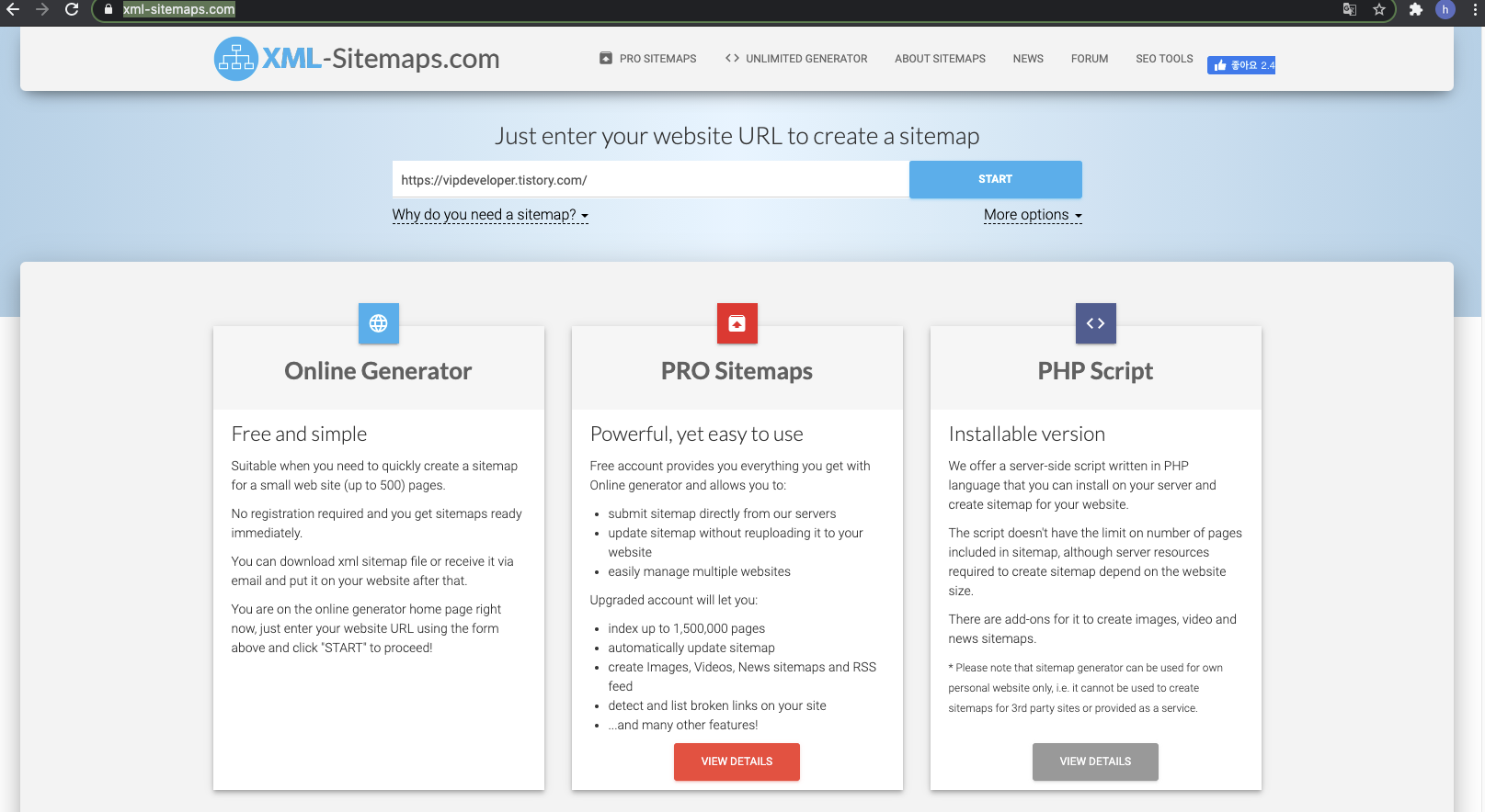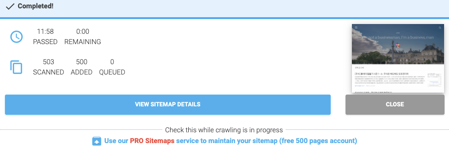 자 완료가 되었다. 무료 버전은 500Page만 무료라고 한다. 내 블로그 글이 500개가 안되는데 넘어갔다!... 음. 뭐 일단