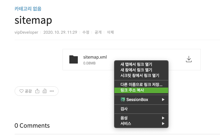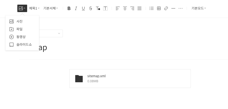 4. 블로그에서 새로운 글쓰기를 하여 다운로드 받은 사이트 맵을 업로드 한다