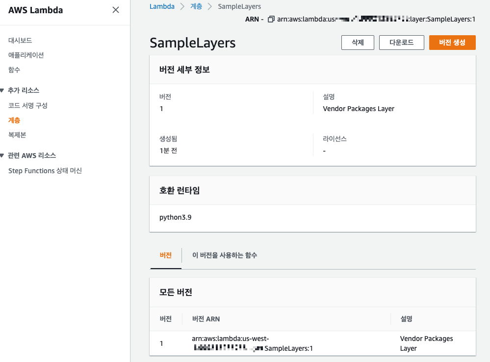 계층 메뉴에서 배포한 SampleLayers를 확인해보자 (아.. layer로 했어야되는데 s 왜붙였지..)
