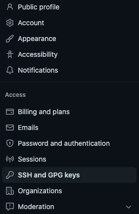깃헙 페이지에서 Account 페이지로 이동 후 다음 메뉴(SSH and GPG keys)로 이동한다.